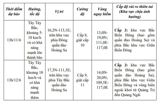 Trung tâm Dự báo khí tượng thủy văn quốc gia cho biết, hồi 13h ngày 10/6, vị trí tâm áp thấp nhiệt đới ở vào khoảng 15,3 độ Vĩ Bắc; 114,8 độ Kinh Đông, cách quần đảo Hoàng Sa khoảng 360 km về phía Đông Đông Nam.